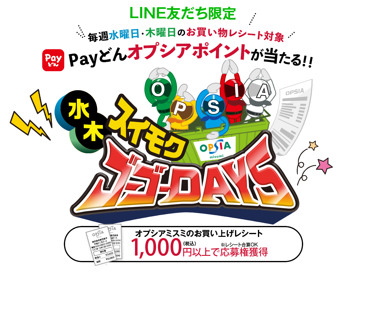 - ①毎週水曜日・木曜日(23:59まで)にオプシアミスミの対象店舗でお買い物をした税込1,000円以上のレシートをお持ちの方