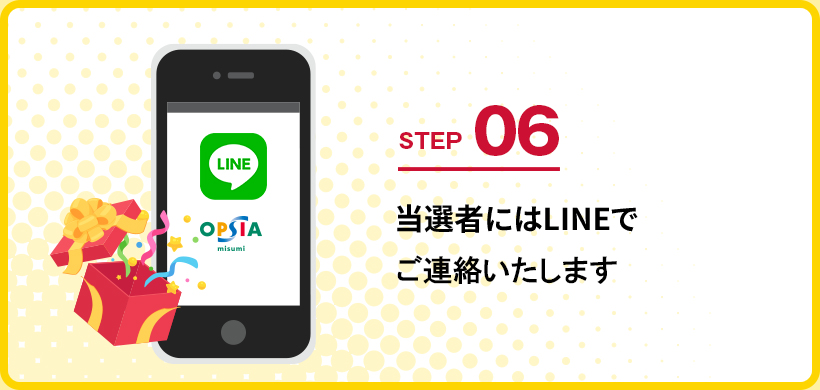 ・翌月中旬ごろ、ご当選者様へのみ、オプシアミスミLINE公式アカウントより応募時に利用されたLINE アカウントへご連絡させていただきますが、都合によりご連絡が多少前後する場合もございますので、あらかじめご了承ください。